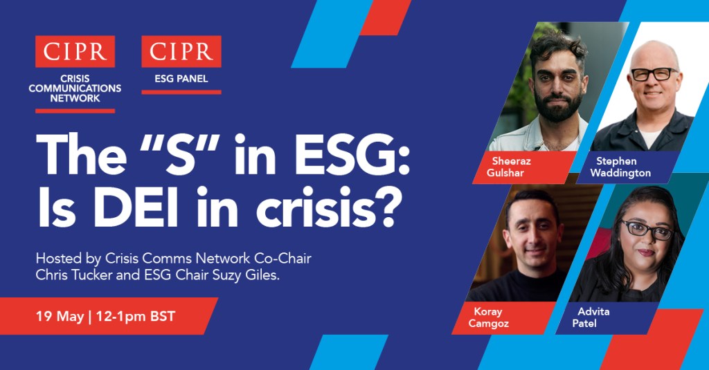 Certainly, time also to stand back and look at what your organisations are seeking to do in this important field. A knee-jerk reaction to the backlash coming out of the US could well be a dangerous one. A communications strategy rooted in a good understanding of all our stakeholders and what they expect from us is required. Stephen Waddington in a recent Substack post sought to create a useful framework to guide our thinking. And here at the CIPR Crisis Communications Network we are doing our bit to help with a Webinar we are hosting jointly with the CIPR ESG Panel – “The ‘S’ in the ESG – is D,E & I in crisis?” at 12.00pm on Monday, May 19th.